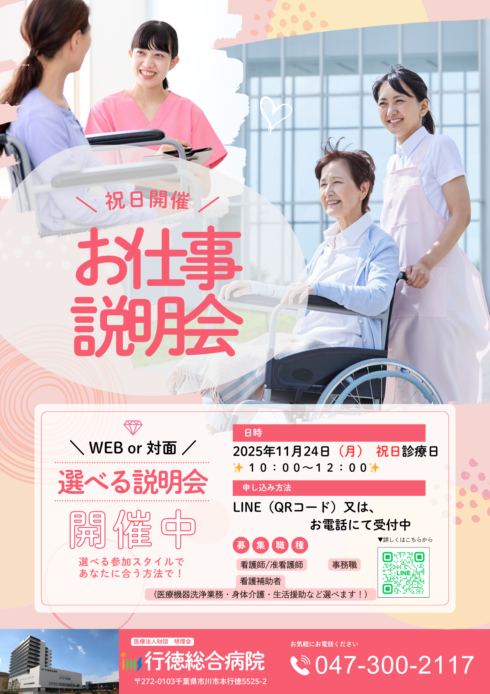 | 応募方法 | [新卒](第二新卒・既卒を含む) 当院採⽤担当公式LINEもしくはお電話でエントリーください。 [LINE] @509abvpj [電話番号] 047-300-2117(総務課直通) [中途] 下記のお問い合わせフォームにてご応募いただくか、下記のお問い合わせ先に電話または、メールでご連絡ください。 [お問合せ先] 総務課 採用担当 [電話番号] 047-300-2117(総務課直通) [メールアドレス] gyoutoku.jinji@gyo-toku.jp |
